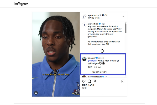 지난 26일(한국시간) 토트넘이 공식 소셜네트워크서비스(SNS)를 통해 ‘인종차별 금지(No Room For Racism)’ 캠페인의 일환으로 리 밸리 초등학교를 방문해 인종차별에 대한 자신의 경험을 공유하면서 다음 세대에게 영감을 준 마티스 텔(20)의 소식을 전하자, 손흥민(33·로스앤젤레스 FC)이 이렇게 댓글을 달면서 텔을 격려했다.