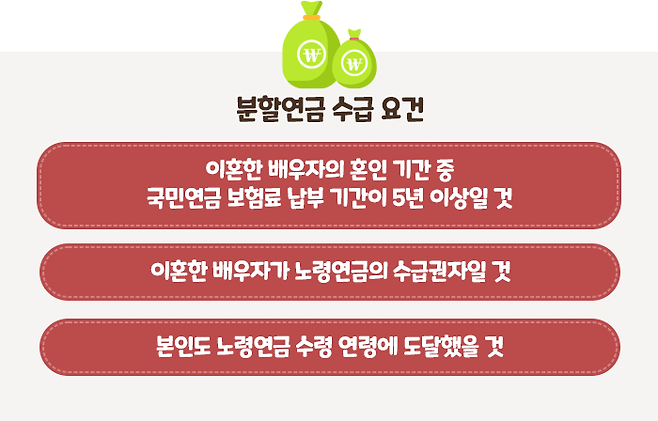 먼저 이혼한 상태여야 하며, 혼인 중에 국민연금 보험료를 낸 기간이 5년 이상이어야 합니다.