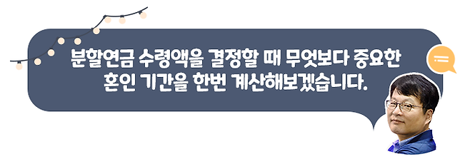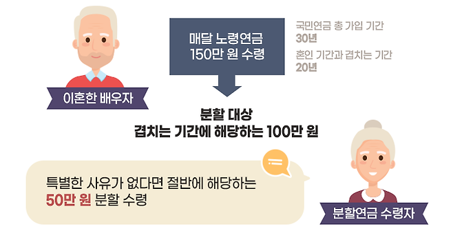 이혼한 배우자의 국민연금 가입 기간은 30년이고, 이중 혼인 기간과 겹치는 기간은 20년입니다. 이 경우 분할 대상이 되는 연금은 150만 원의 3분의 2에 해당하는 100만 원입니다.