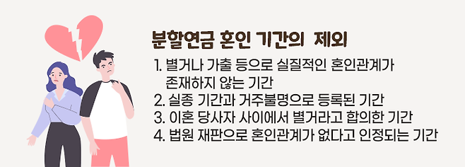 이와 관련해 헌법재판소는 2016년 12월 30일에 별거나 가출 등으로 실질적인 혼인관계가 존재하지 않던 기간을 일률적으로 혼인 기간에 넣도록 한 국민연금법 규정을 ‘부부협력으로 형성한 공동재산 분배’한다는 분할연금의 취지에 어긋난다며 헌법불합치 결정을 내렸습니다.