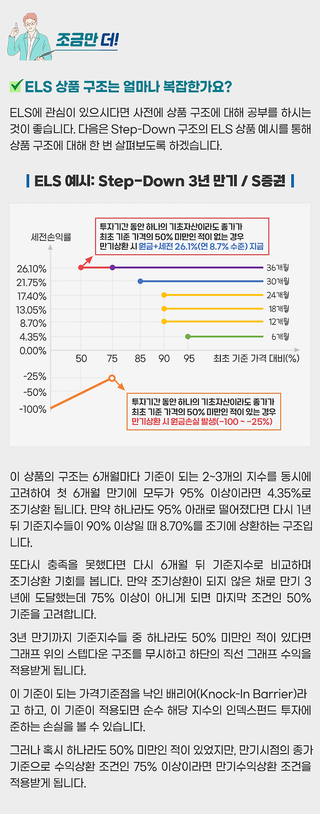 물론 동일한 조건일 경우에 낙인 조건을 없애면 ELS의 제시 수익률은 낮아질 수밖에 없습니다.