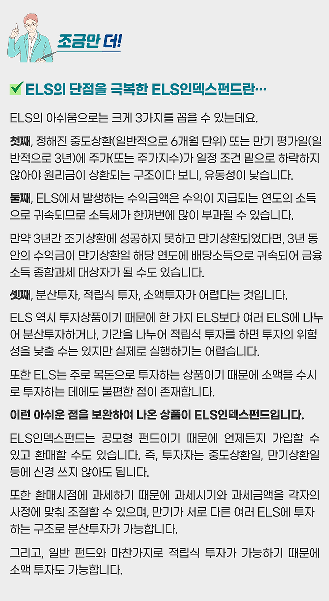 그리고, 주식과 채권을 혼합하여 투자 리스크를 관리하는 혼합형 펀드 외에도, 중위험·중수익을 대표하는 순수한 상품으로 ELS(Equity Linked Securities, 주가연계증권)도 있는데요.