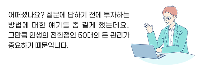 50대의 투자는 돈을 잃으면 타격이 크기 때문에 원금을 지키면서, 적어도 정기예금보다는 더 높은 수익을 내야 합니다.