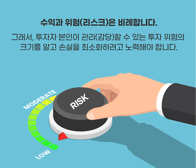 그렇기 때문에, 투자자 본인이 관리(감당)할 수 있는 투자 위험(리스크)의 크기를 알고 손실을 최소화하려고 노력해야 하며, 투자는 가급적 여유자금으로 해야 합니다.