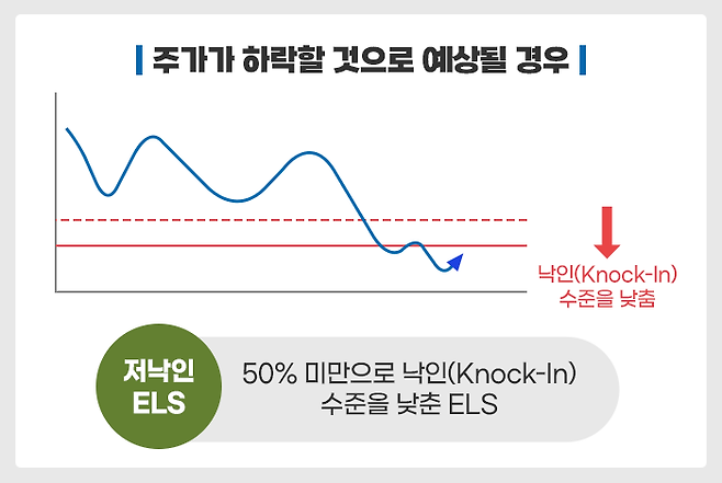 낙인 수준이 낮아지면 ELS 제시수익률(쿠폰)도 낮아져 수익성이 하락하지만, 안전성은 높아집니다. 그래서, 주가가 하락할 것으로 예상되는 때에는 최대한 낙인 수준을 낮춰서 주가가 낙인 수준에 도달할 확률을 낮추는 안전 전략이 필요합니다.