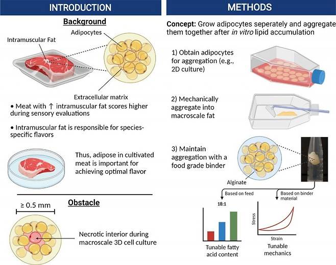 연구팀 관계자는 "살아있는 동물은 혈관이 무수하게 분포해 조직 깊숙이 산소와 양분을 전달하므로 지방이 늘어도 문제가 없다"며 "지방이 인위적으로 늘어나면 배양육 내 세포는 쉽게 죽어버린다"고 설명했다.