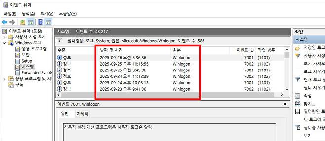 시스템 이벤트 중 이벤트 ID 7001을 4624와 함께 확인하면 훨씬 확실한 증거를 확보할 수 있다. 7001 이벤트는 4624 로그온 기록과 더불어, 시스템 차원의 전원 켜짐·꺼짐 시점을 보여주기 때문에 무단 사용 여부를 교차 검증하는 데 유용하다. 방법은 간단하다. 처음과 마찬가지로 왼쪽 창에서 [Windows 로그 → 시스템]으로 이동한다. 이어서 오른쪽의 [현재 로그 필터링]을 클릭하면 동일한 팝업 창이 뜨는데, 이번에는 [원본을 Winlogon]으로 지정하면 된다.