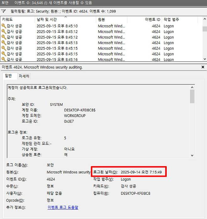 이벤트 뷰어의 가운데 창에는 다양한 이벤트가 ID 번호와 함께 기록되어 있다. 여기서 우리가 주목해야 할 것은 바로 ‘성공적인 로그온’, 즉 이벤트 ID 4624다. 이 항목을 찾아 클릭하면 상세 내역을 확인할 수 있다. 만약 내가 자리를 비운 동안 PC가 켜졌다면, 해당 시간대의 가장 이른 4624 이벤트가 바로 그 증거가 된다.