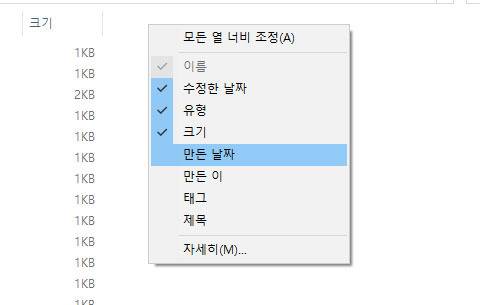 파일을 단순히 열어본 경우뿐만 아니라, 문서나 이미지를 새로 만들어 PC에 저장했을 때도 기록은 남는다. 이럴 땐 탐색기 상단의 카테고리 항목에서 우클릭해 [만든 날짜] 항목을 추가한 뒤 정렬하면, 새로 생성된 파일까지 한눈에 확인할 수 있다.