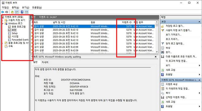 하지만 이벤트는 많게는 한 시간에 수천 건씩 발생하기 때문에, 4624나 4625 같은 특정 이벤트 ID만 손으로 일일이 찾기에는 너무 번거롭고 시간이 오래 걸린다. 이럴 때는 이벤트 뷰어의 오른쪽 [작업] 창에서 [현재 로그 필터링]을 클릭하면 된다. 팝업 창이 열리면 [이벤트 ID] 항목에 4624를 입력한 뒤 확인을 누른다. 그러면 정보창 상단에 이벤트 ID 4624만 모아 정렬된다. 이 방법을 활용하면 성공적인 로그온 기록만 한눈에 확인할 수 있어, 무단 사용이 의심되는 시간대의 흔적을 훨씬 빠르게 찾아낼 수 있다.