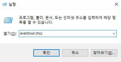 두 번째는 [Win+R] 단축키로 [실행] 창을 열고, [eventvwr.msc]라고 입력한 뒤 확인을 누르는 방법이다. 이렇게 해도 이벤트 뷰어가 바로 시작된다.