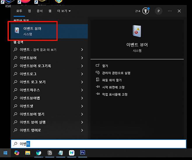 이벤트 뷰어를 실행하는 방법은 크게 두 가지가 있다. 첫 번째는 Win 키를 누른 뒤 ‘이벤트’라고 입력하는 것이다. 그러면 자동으로 응용 프로그램이 검색되며 실행 메뉴가 나타난다. 여기서 엔터를 누르거나 마우스로 클릭하면 곧바로 실행된다.