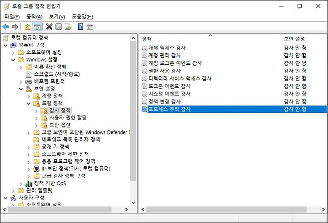 그 후 왼쪽 로컬 컴퓨터 정책 창에서 [컴퓨터 구성 → Windows 설정 → 보안 설정 → 로컬 정책 → 감사 정책] 순서로 이동한다.