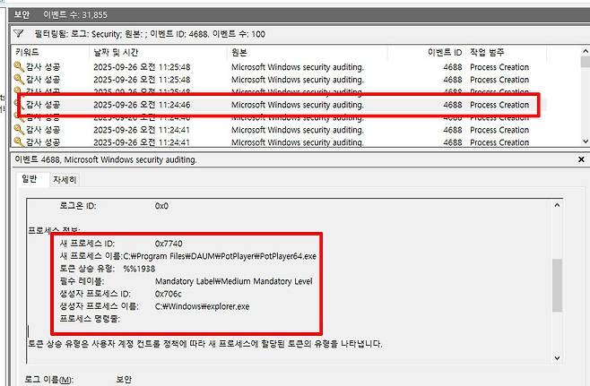 앞서와 동일하게 [현재 로그 필터링]을 눌러 이벤트 ID에 4688을 입력해 보자. 이 ID는 새로운 프로세스가 생성되었다는 의미로, 어떤 응용 프로그램이 실행되었는지를 알려준다. 해당 이벤트를 클릭한 뒤 하단의 [자세히] 탭을 열면 실행된 프로그램의 정보가 기록되어 있어 결정적인 증거를 확보할 수 있다. 위 이미지를 보면 해당 시간대에 동영상 플레이어인 팟플레이어(PotPlayer64.exe)가 실행되었다는 내역이 남아 있는 것을 확인할 수 있다.