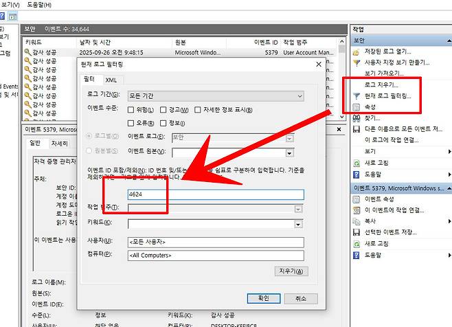 하지만 이벤트는 많게는 한 시간에 수천 건씩 발생하기 때문에, 4624나 4625 같은 특정 이벤트 ID만 손으로 일일이 찾기에는 너무 번거롭고 시간이 오래 걸린다. 이럴 때는 이벤트 뷰어의 오른쪽 [작업] 창에서 [현재 로그 필터링]을 클릭하면 된다. 팝업 창이 열리면 [이벤트 ID] 항목에 4624를 입력한 뒤 확인을 누른다. 그러면 정보창 상단에 이벤트 ID 4624만 모아 정렬된다. 이 방법을 활용하면 성공적인 로그온 기록만 한눈에 확인할 수 있어, 무단 사용이 의심되는 시간대의 흔적을 훨씬 빠르게 찾아낼 수 있다.