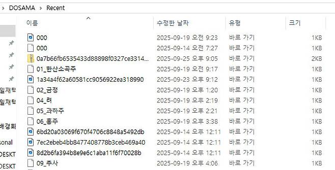 그러면 탐색기 창이 열리면서 최근에 사용했던 문서, 사진, 프로그램 바로가기 등의 목록이 나타난다. 여기서 무단 사용이 의심되는 시간대에 내가 열어본 적 없는 낯선 파일이 있는지 확인해 보자. 파일 목록은 이름이나 수정한 날짜 기준으로 정렬할 수 있어 원하는 기록을 훨씬 쉽게 찾아낼 수 있다.