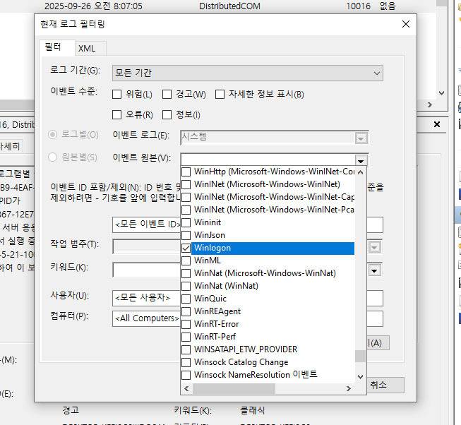 시스템 이벤트 중 이벤트 ID 7001을 4624와 함께 확인하면 훨씬 확실한 증거를 확보할 수 있다. 7001 이벤트는 4624 로그온 기록과 더불어, 시스템 차원의 전원 켜짐·꺼짐 시점을 보여주기 때문에 무단 사용 여부를 교차 검증하는 데 유용하다. 방법은 간단하다. 처음과 마찬가지로 왼쪽 창에서 [Windows 로그 → 시스템]으로 이동한다. 이어서 오른쪽의 [현재 로그 필터링]을 클릭하면 동일한 팝업 창이 뜨는데, 이번에는 [원본을 Winlogon]으로 지정하면 된다.
