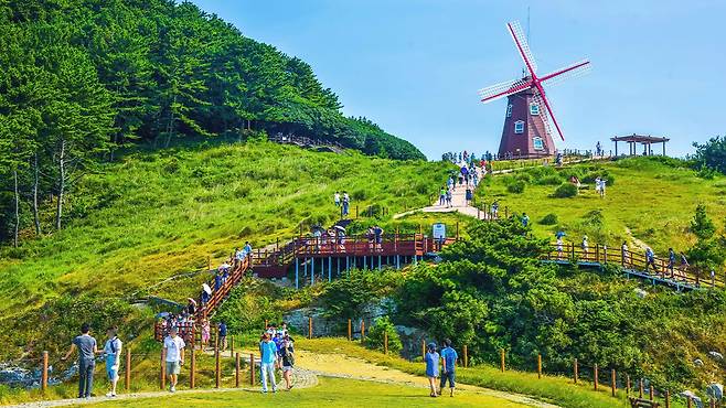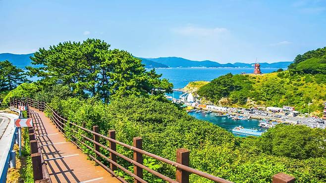 언덕 정상 풍차까지는 계단이 필요하지만, 중간 데크길에서도 충분히 남해의 시원한 파노라마를 감상할 수 있음
