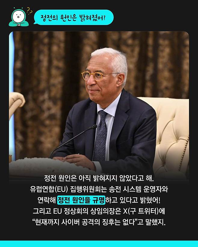 스페인 전력망 관리업체카는 정전의 원인이 아직 밝혀지지 않았으며, 오후 3시 기준 반도의 북부와 남부, 서부 지역 일부에는 전력 공급이 재개됐다고 밝혔습니다.