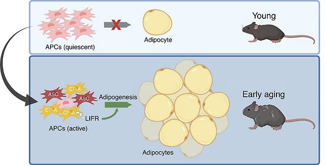 한편, APC는 노화로 인해 ‘연령 특이적 전지방세포(CP-A)’라는 새로운 유형의 줄기세포로 변하는 것으로 알려졌다. 중년 이후에 발생하는 CP-A는 새로운 지방 세포를 지속적으로 만들어내며, 이것이 중년 이후 체중이 더 쉽게 증가하는 이유로 꼽힌다.