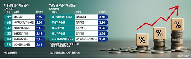 1금융권에선 수협은행의 첫만남우대예금 금리가 연 2.9%(최고금리 기준)로 가장 높다. 기본금리는 연 1.85%지만 최근 1년간 수협은행 예·적금에 가입하지 않았다면 1%포인트, 마케팅 동의 시 0.05%포인트 우대금리가 붙는다. 이 은행에는 우대금리 없이 기본으로 연 2.7% 금리를 제공하는 ‘헤이정기예금’도 있다. SC제일은행(e그린세이브예금)과 제주은행(J정기예금)도 최고 연 2.75% 금리를 내걸고 있다.