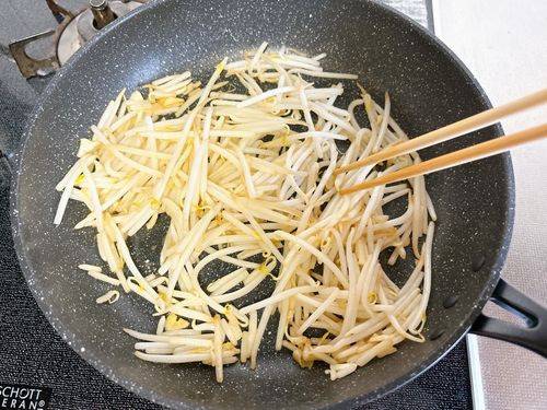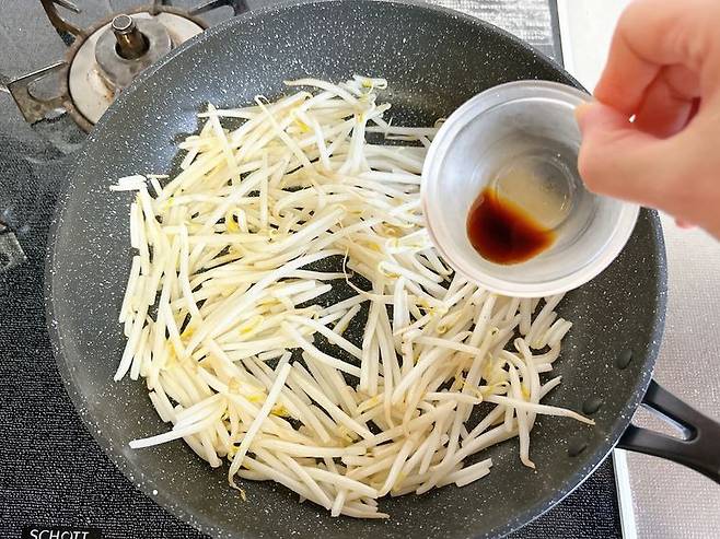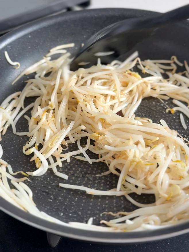 중불로 달군 팬에 기름을 둘러 달군 후 콩나물을 넣는다.