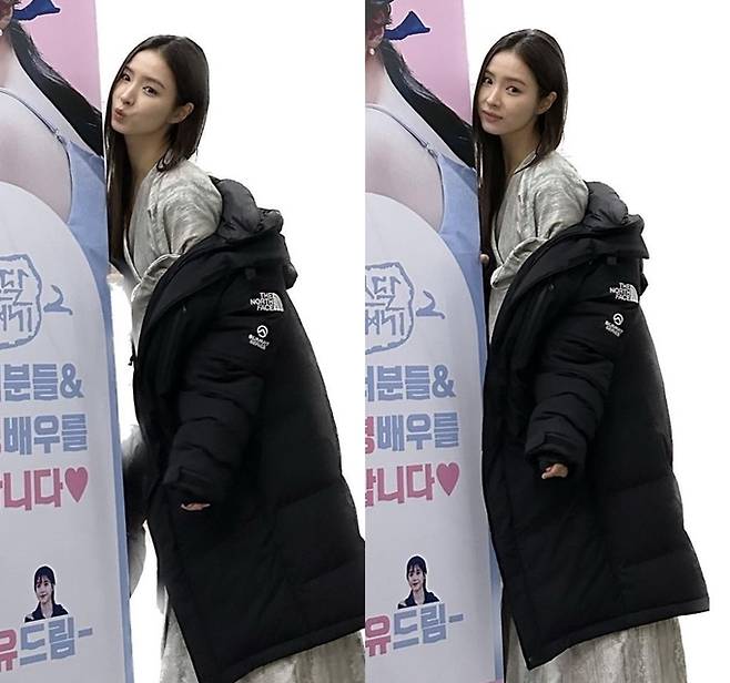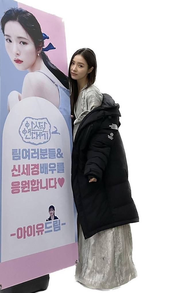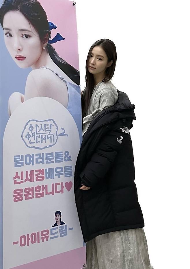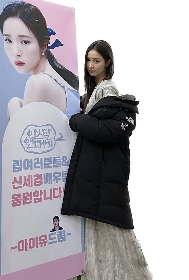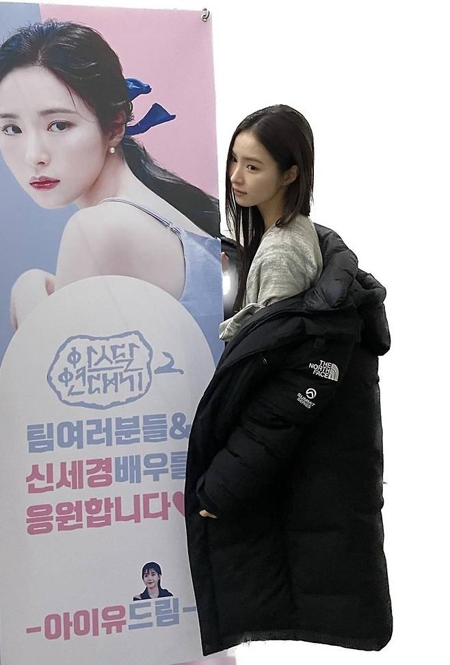 공개한 사진에서 신세경은 ‘아스날 연대기’ 촬영 의상에 블랙 롱 패딩을 걸치고 홍보물을 꼭 끌어안은 채 감사 인사를 전했다.