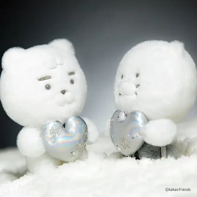 춘식이와 라이언이 겨울을 앞두고 흰옷을 입었다. Y2K 감성의 실버 하트를 품고 있는 하얀 춘식이와 라이언 인형이다. 뽀얗고 부드러운 털이 크리스마스 선물로 딱일 듯. 가격은 1만 6,000원.