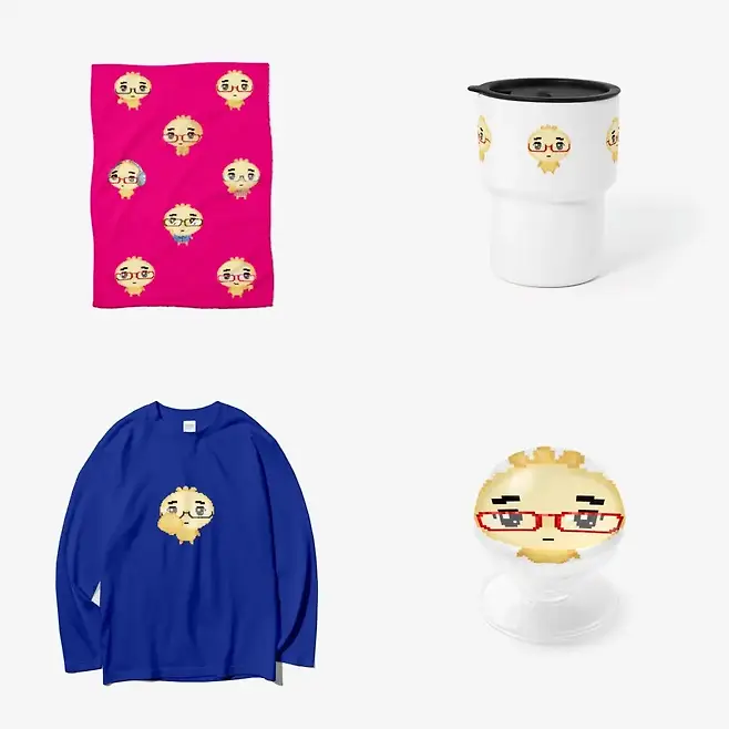 심드렁한 표정이 킥인 ‘안경만두’라는 캐릭터가 인기다. 이름 그대로 안경을 쓴 만두인데, 빨간 안경 너머 진지한 듯 묘한 표정이 매력이다. 마플샵에서 안경만두의 다양한 굿즈를 판매하고 있다. 담요, 키링부터 텀블러, 맥세이프 지갑, 안경만두가 무심하게 만두를 내밀고 있는 ‘만두나 드세요 옷’까지.