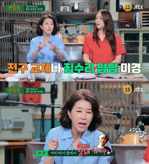 가정 안에서도 성역할이 전통적이지 않다. 집안 수리는 김미경이 맡고, 남편은 옆에서 커피를 들고 응원하는 쪽이다.