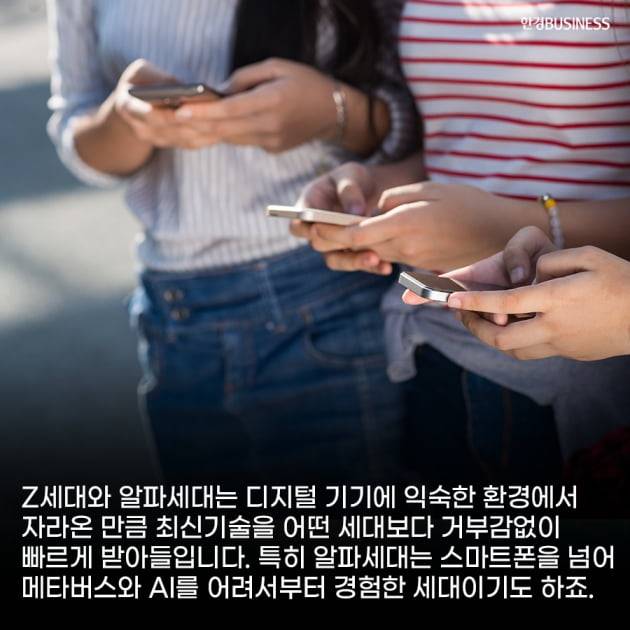 Z세대와 알파세대는 디지털 기기에 익숙한 환경에서 자라온 만큼 최신기술을 어떤 세대보다 거부감없이 빠르게 받아들입니다. 특히 알파세대는 스마트폰을 넘어 메타버스와 AI를 어려서부터 경험한 세대이기도 하죠.