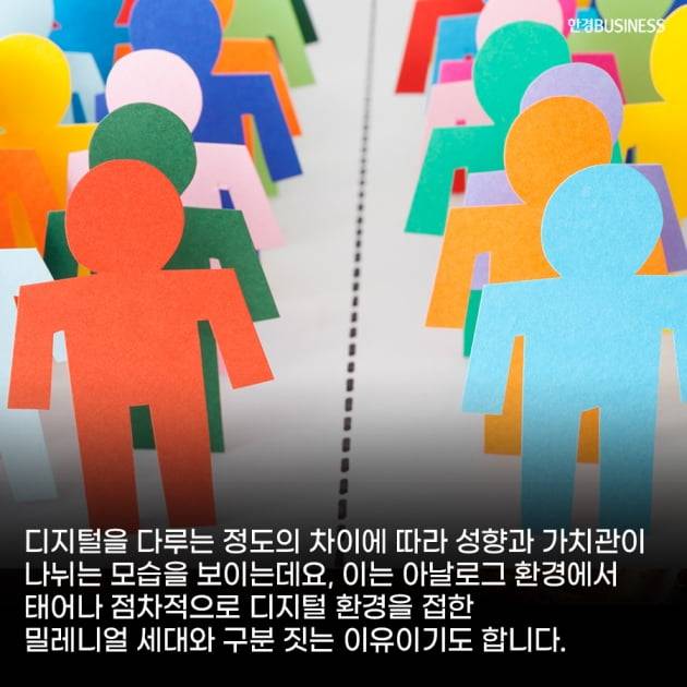 디지털을 다루는 정도의 차이에 따라 성향과 가치관이 나뉘는 모습을 보이는데요, 이는 아날로그 환경에서 태어나 점차적으로 디지털 환경을 접한 밀레니얼 세대와 구분 짓는 이유이기도 합니다.