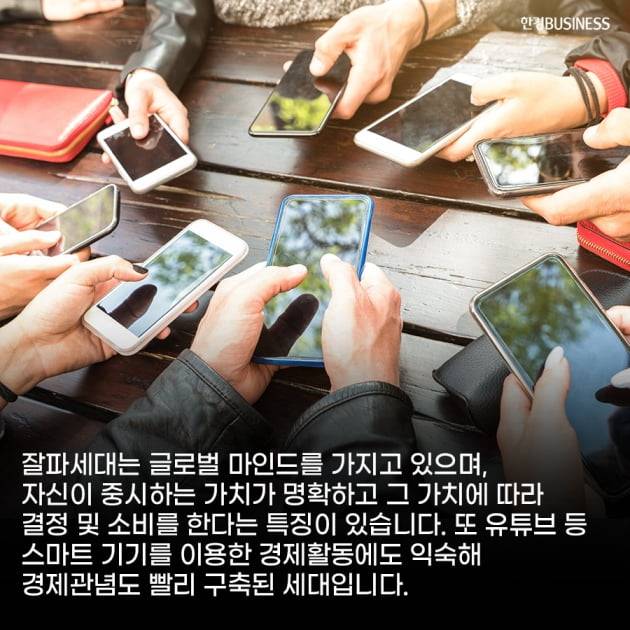 잘파세대는 글로벌 마인드를 가지고 있으며, 자신이 중시하는 가치가 명확하고 그 가치에 따라 결정 및 소비를 한다는 특징이 있습니다. 또 유튜브 등 스마트 기기를 이용한 경제활동에도 익숙해 경제관념도 빨리 구축된 세대입니다.