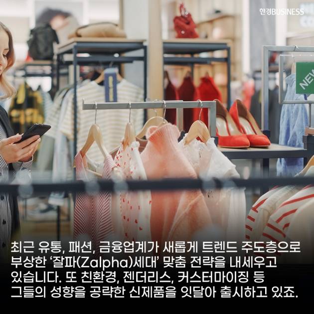 최근 유통, 패션, 금융업계가 새롭게 트렌드 주도층으로 부상한 ‘잘파(Zalpha)세대’ 맞춤 전략을 내세우고 있습니다. 또 친환경, 젠더리스, 커스터마이징 등 그들의 성향을 공략한 신제품을 잇달아 출시하고 있죠.