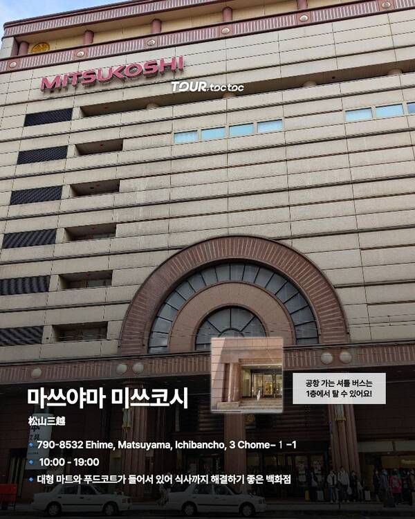 마쓰야마 시내 중심가에 위치한 백화점 ‘미쓰코시’는 쇼핑뿐 아니라 한 끼 식사까지 해결할 수 있는 편리한 장소입니다.