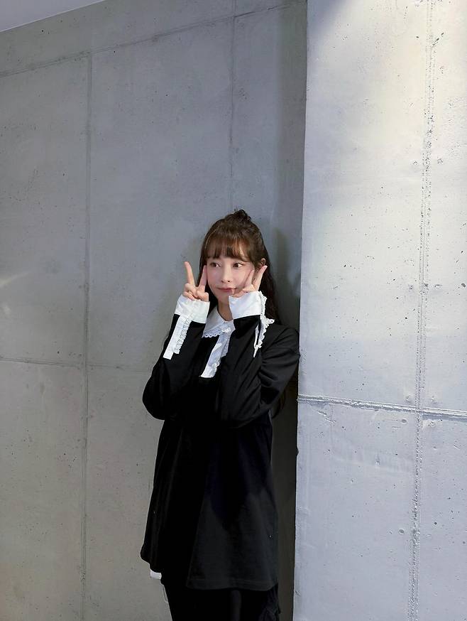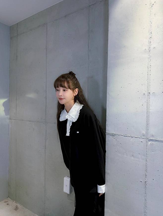 자칫 평범해 보일 수 있는 블랙 상의에 정교한 자수가 들어간 화이트 레이스 깃을 레이어드함으로써, 캐주얼함 속에 로맨틱한 소녀 감성을 절묘하게 녹여냈는데요.