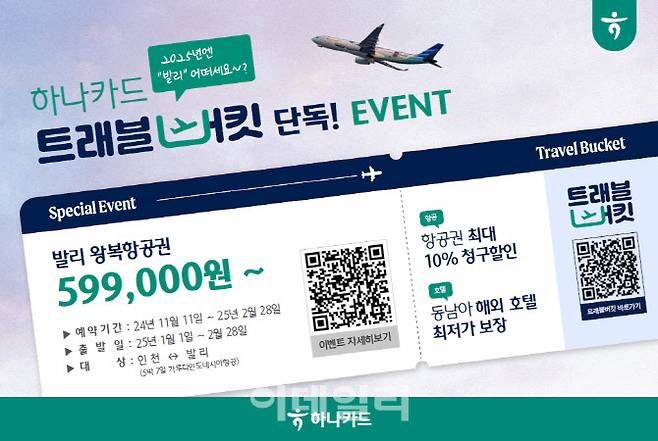 구체적으로 하나카드 ‘트래블버킷’에서 국제선 항공권 구매 시 하나카드 전월 실적에 따라 최대 10% 청구할인을 받을 수 있으며, 최대 할인을 받을 경우 발리 왕복항공권을 유류세 포함 59만9000원에 구매할 수 있다.