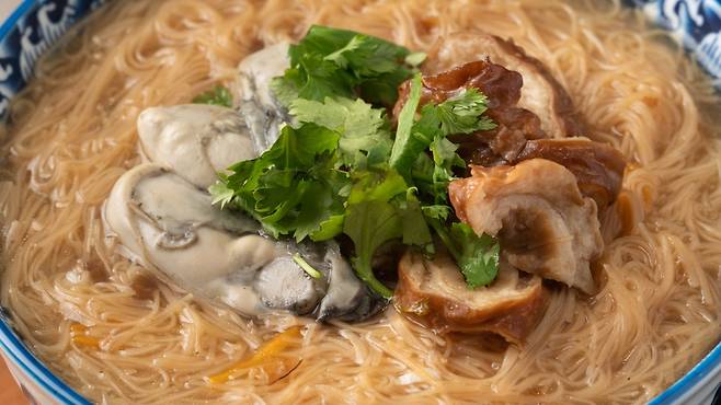 이 국수는 대만에서 자주 먹는 얇은 면을 사용하며, 전분가루를 묻힌 굴을 물에 데쳐서 넣고, 부드럽게 조린 대창도 함께 들어갑니다. 이런 조합이 만들어내는 고소하고 깊은 맛은 정말 일품입니다. 육수를 만들 때는 오징어, 가쓰오부시, 닭 등을 사용하여 국물이 걸쭉하게 나오도록 합니다.