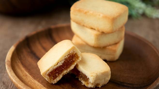 한 입 먹으면 과자 안에 들어 있는 파인애플 잼의 달콤한 맛이 입 안에 가득 퍼집니다. 잼은 파인애플뿐만 아니라 다양한 과일로 만들어지며 쫀득한 식감을 자랑합니다.