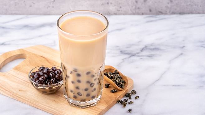 이 음료는 다양한 맛을 가진 밀크티와 함께 녹말로 만든 곡물 구슬, 젤리, 과일 등 다양한 토핑으로 구성되어 있습니다.