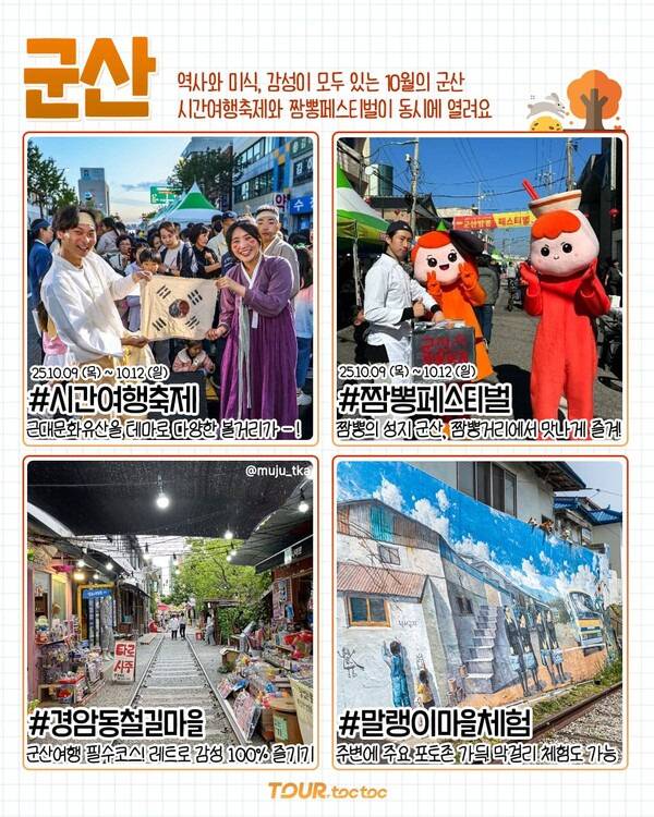역사와 미식, 감성이 모두 펼쳐지는 10월 국내여행지 군산입니다. 선선한 날씨로 야외활동을 하기 좋은 10월에 딱 가볼만한 곳인데요. 10월 9일부터 12일까지, 시간여행축제와 짬뽕페스티벌이 동시에 개최되어 더 풍성하게 즐길 수 있습니다.