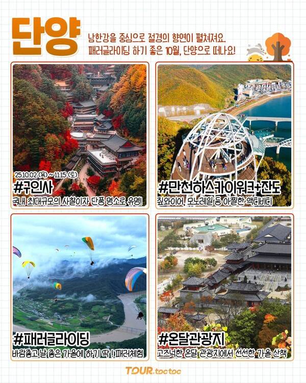 남한강을 중심으로 절경이 펼쳐지고, 10월 가을 바람을 온몸으로 느낄 수 있는 단양도 10월 국내여행지로 제격입니다. 지금 계절에 딱인 패러글라이딩 성지로도 유명한 단양에서는 덥지도, 춥지도 않은 10월에 아직은 녹음이 엿보이는 단양 절경을 하늘에서 바라볼 수 있죠.