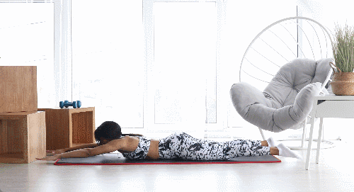 매트에 배를 대고 엎드린 상태에서 팔을 앞으로 쭉 뻗습니다. 상체와 하체를 동시에 공중으로 들어 올립니다. 이때 몸을 가능한 한 길게 늘여주세요. 천천히 원래 자세로 돌아옵니다.