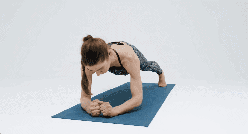 매트에 팔꿈치를 대고 엎드린 상태에서 몸을 일자로 만듭니다. 팔꿈치 플랭크 자세에서 엉덩이를 들어 올리며 상체를 낮춥니다. 다시 팔꿈치 플랭크 자세로 돌아옵니다. 2가지 동작을 반복하세요.