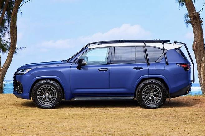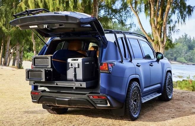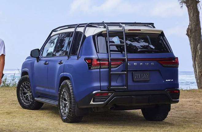 LX 서프 콘셉트는 해안가에서의 활동을 고려해 설계된 맞춤형 SUV입니다. 외관 디자인부터 기능성까지 해변에서의 활용도를 극대화하는 요소들이 반영됐습니다. 차체는 바다를 연상시키는 무광 블루 컬러를 적용했으며, 화이트 루프를 더해 산뜻한 느낌을 줍니다. 20인치 전용 휠과 33인치 올터레인 타이어를 장착해 해변뿐만 아니라 도심과 험로에서도 뛰어난 주행 성능을 발휘할 수 있도록 했습니다. 차량 후면에는 서핑보드를 적재할 수 있는 전용 랙이 장착되었으며, 트렁크 바닥에는 슬라이드 아웃 방식이 적용돼 장비 정리가 더욱 편리해졌습니다. 또한, 루프랙에 쉽게 접근할 수 있도록 설계된 후방 사다리에는 LED 조명이 내장돼 야간에도 유용하게 사용할 수 있습니다.