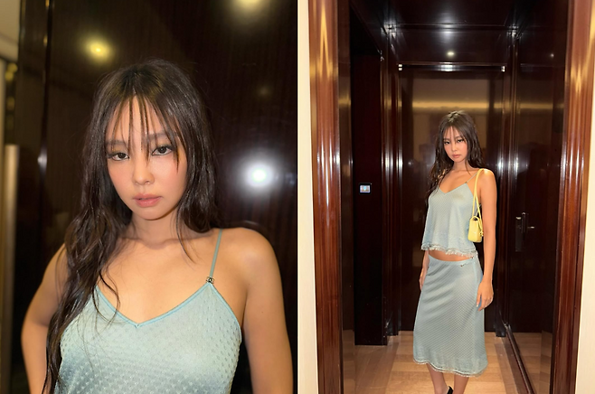 얇은 어깨 끈의 슬립 톱은 제니 특유의 직각 어깨와 가녀린 몸선을 더욱 돋보이게 했다.