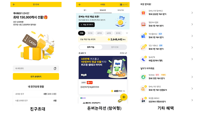 - 친구 추천 시 양쪽 모두에게 리워드 3,000캐시 지급