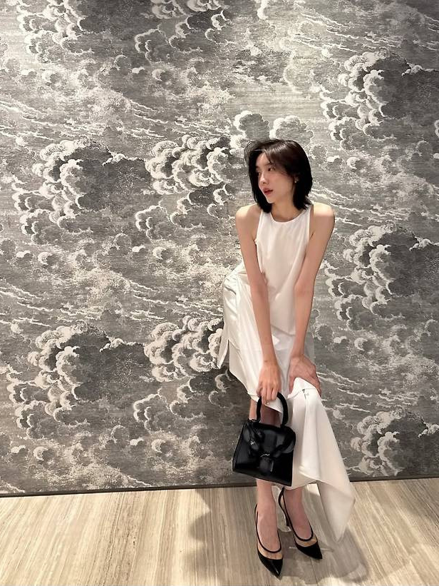블랙 스틸레토 힐과 볼드한 리본 장식 핸드백이 전체 룩에 포인트를 더했으며, 단정하게 넘긴 헤어스타일과 투명한 피부 표현은 ‘모던 여신’의 이미지를 완성했습니다.