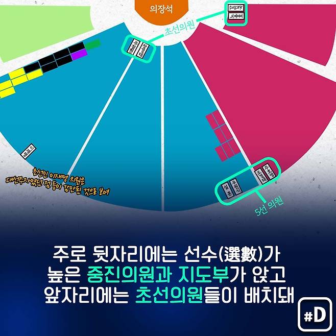 이 때문에 주로 뒷자리에는 선수(選數)가 높은 중진의원과 지도부가 앉고, 앞자리에는 초선의원들이 배치되는데요.