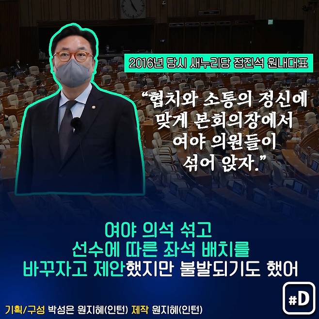 2016년 당시 새누리당 정진석 원내대표가 협치와 소통의 정신에 맞게 좌우로 나뉜 여야의 의석을 섞고, 선수에 따른 좌석 배치도 바꾸자고 제안했지만 불발됐죠.